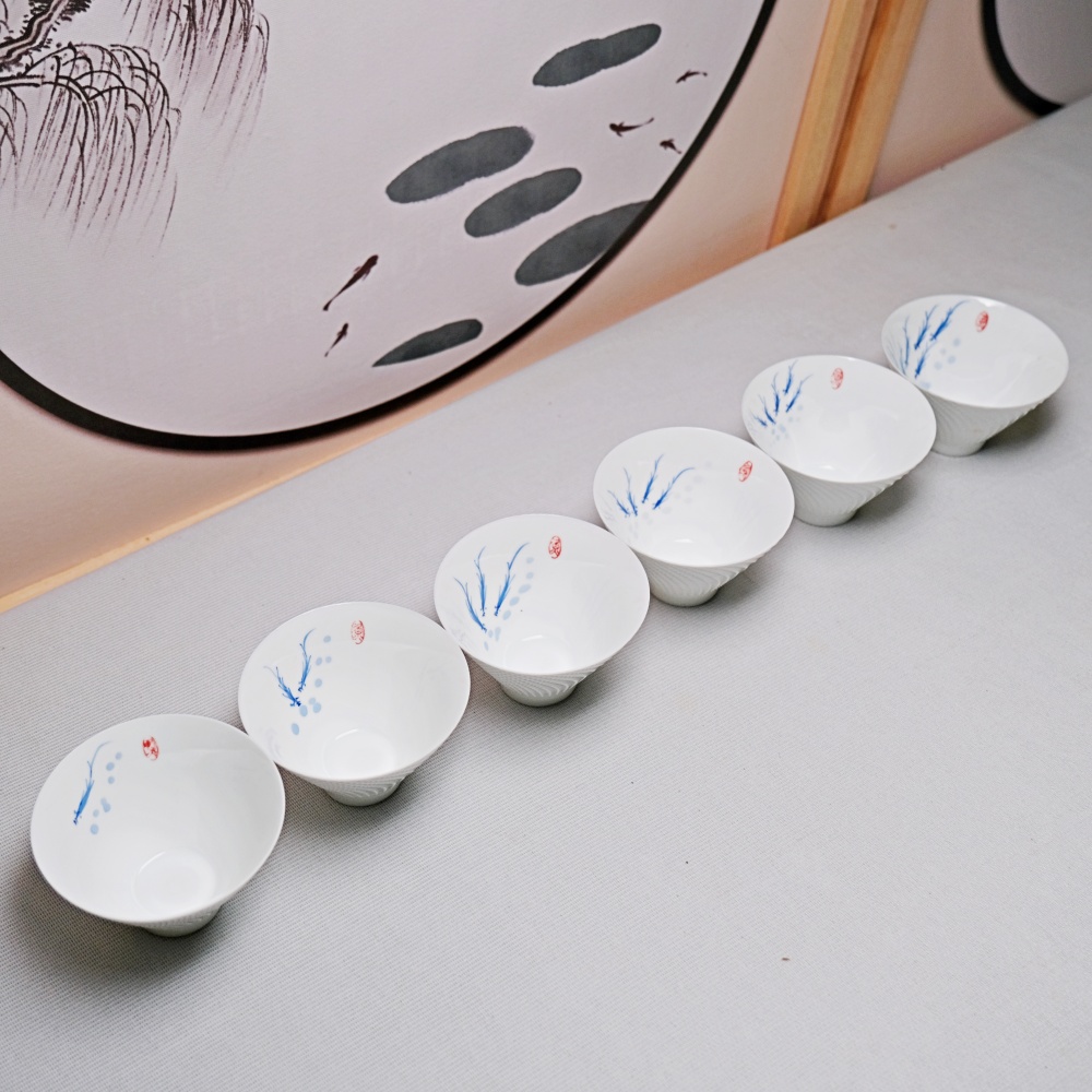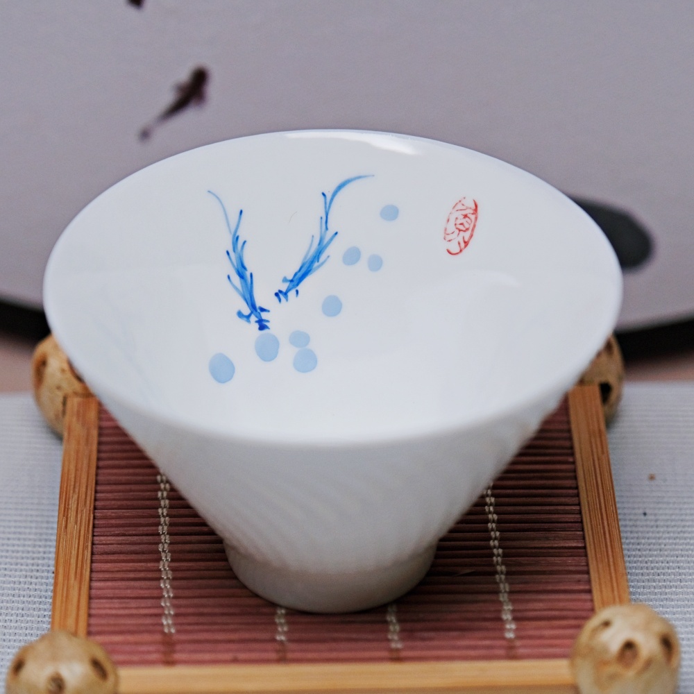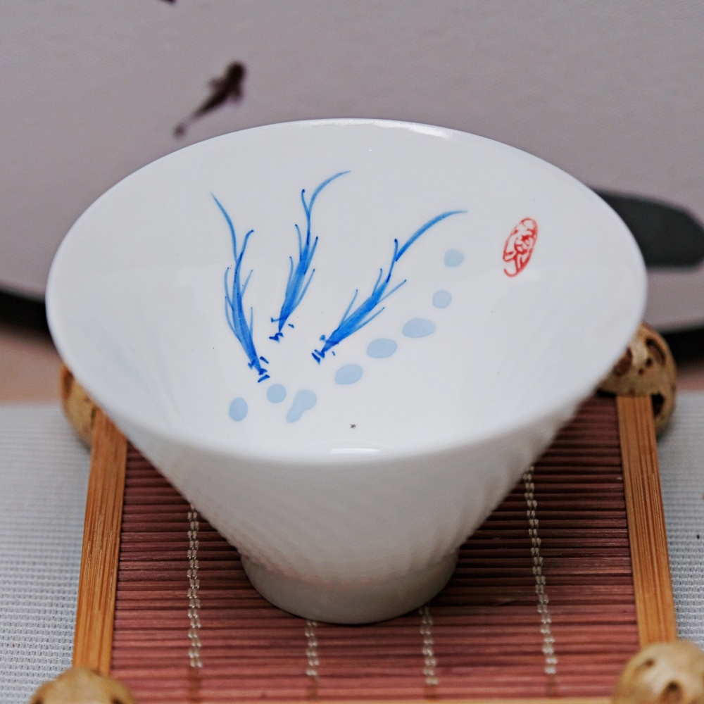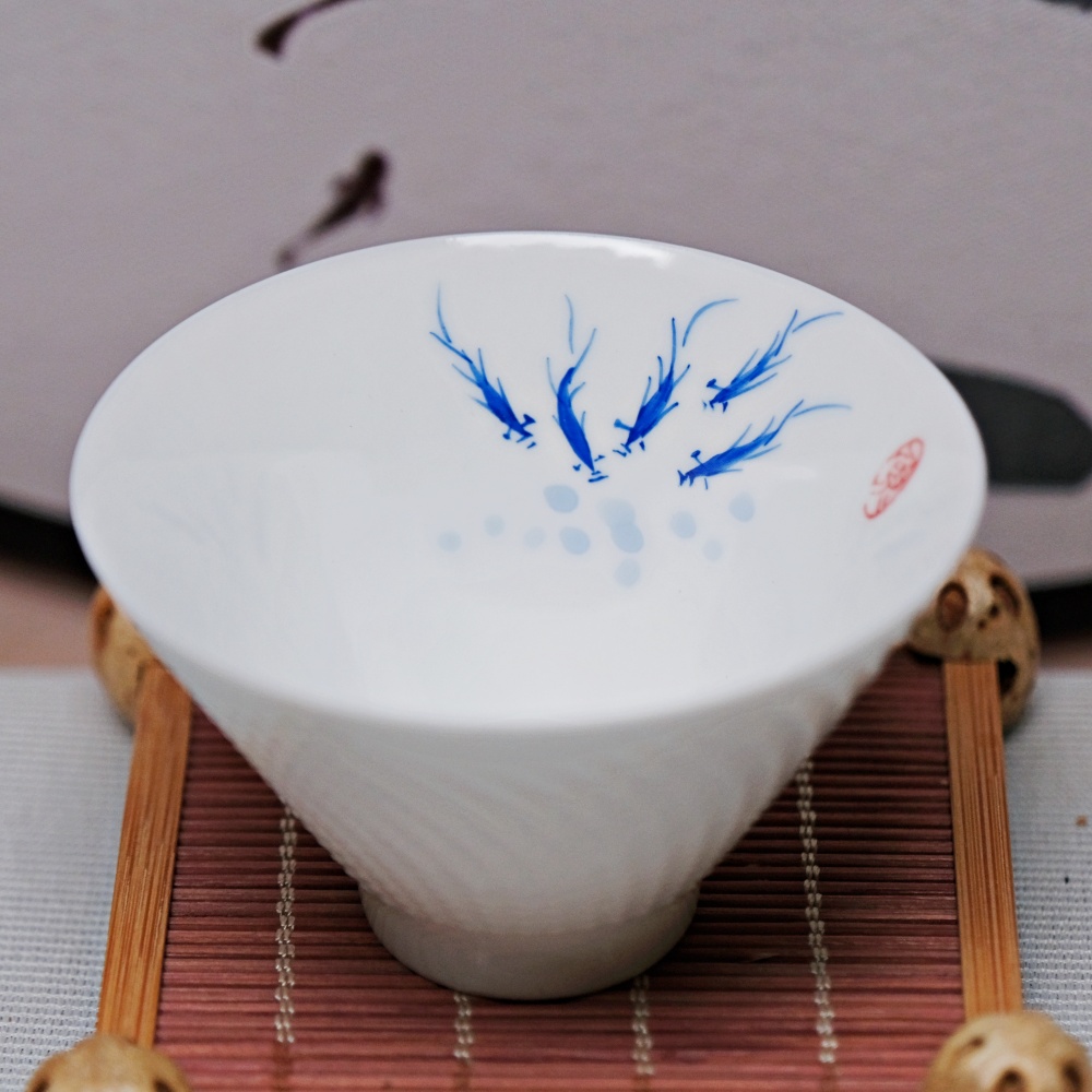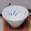 精品骨瓷手繪斗笠杯-游魚款 薄胎白瓷手工茶杯