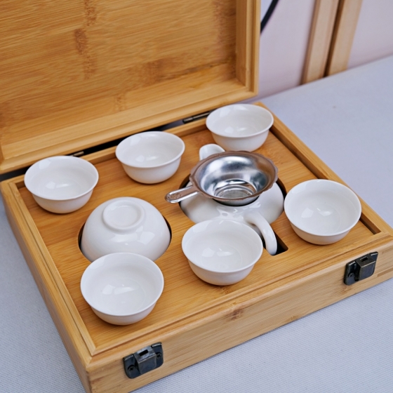 掀蓋竹盒白瓷旅行茶具組 1海1漏1蓋碗6杯1夾子1茶巾 附出水管