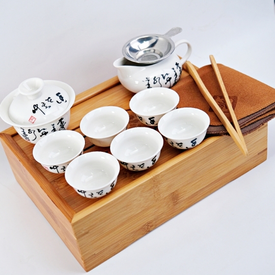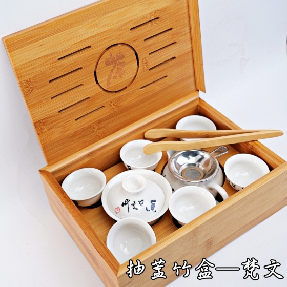 抽蓋竹盒梵文旅行茶具組 1海1漏1蓋碗6杯1夾子1茶巾1茶盤